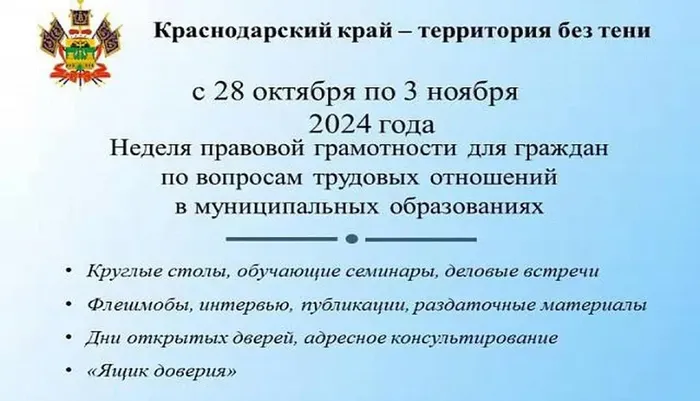 С 28 октября по 3 ноября 2024 года стартует неделя правовой грамотности по вопросам трудовых отношений «Краснодарский край – территория без тени»!